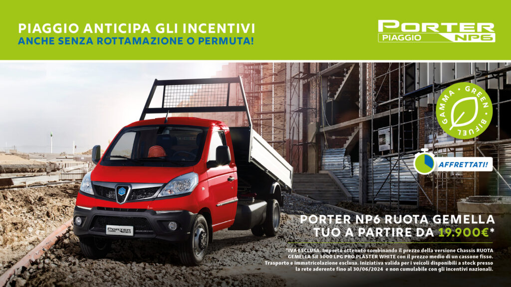 Piaggio Porter NP6 con pianale fisso a partire da 17.250€, Porter con pianale ribaltabile a partire da 18.800€. Vieni in concessionaria in via del Lavoro a Como e scopri tutti i dettagli degli incentivi statali.